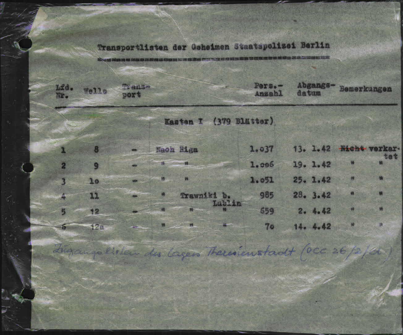 Below is the transport card that shows my great grandfather, Hermann Isakowitz, having been deported from Berlin to Riga in January 1942, as well as the transport list for his deportation. Hermann’s name is the sixth from the top on the list. He was on transport number 9 with 1005 other people.